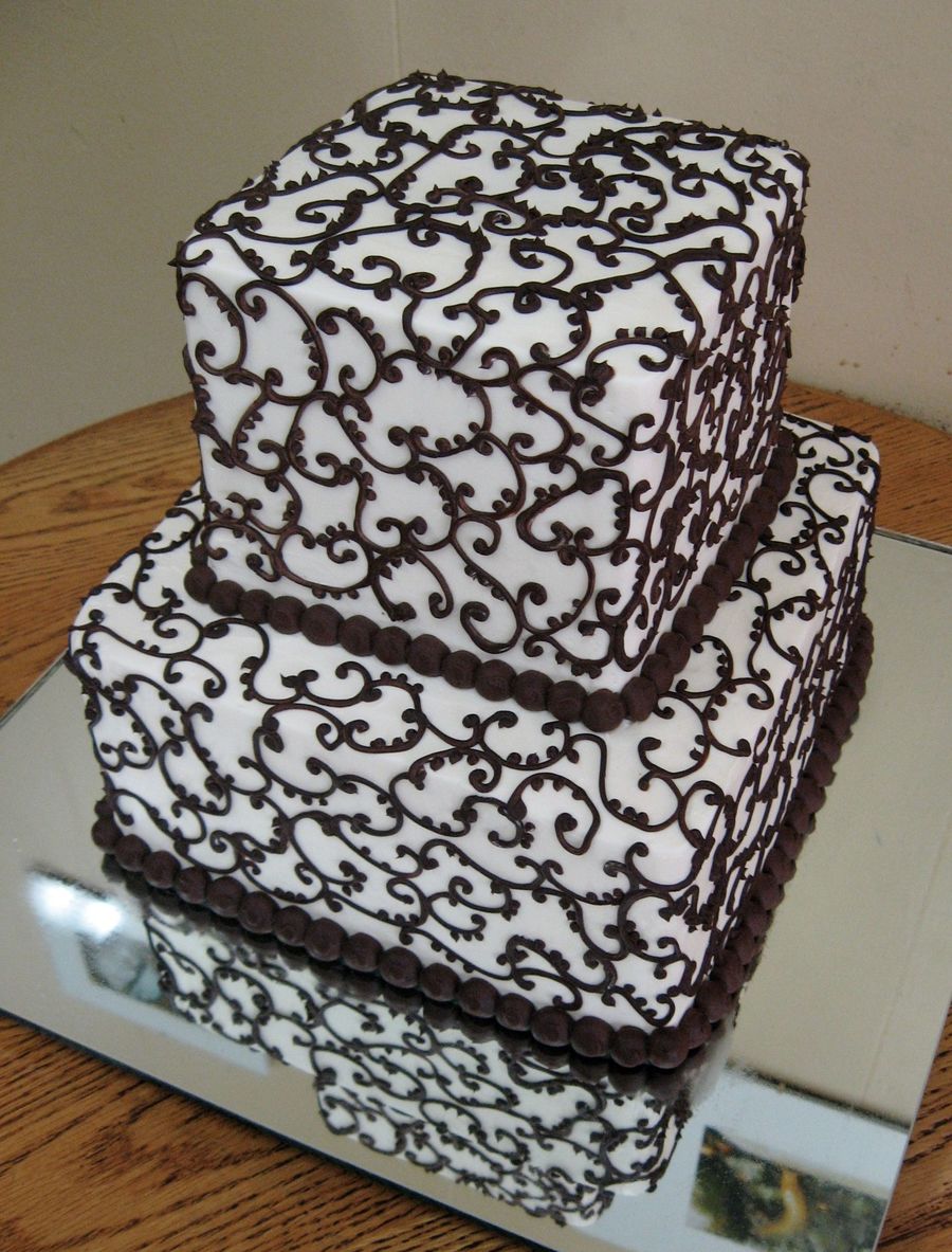 Freehand chocolate lace covering cakes. 6, and 9 inch squares. Not sure where the original lace design is from (a bride brought in a picture, and this was based off of the cake made for that bride). Cakes are iced in Swiss Meringue Buttercream. Borders and lace are Dark Chocolate Ganache. Fall '08