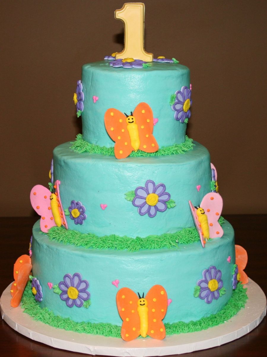 I did this cake for a 1st birthday. It's iced in buttercream and the flowers and butterflies are made from fondant. The 1 on top was made from candy melts.