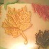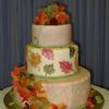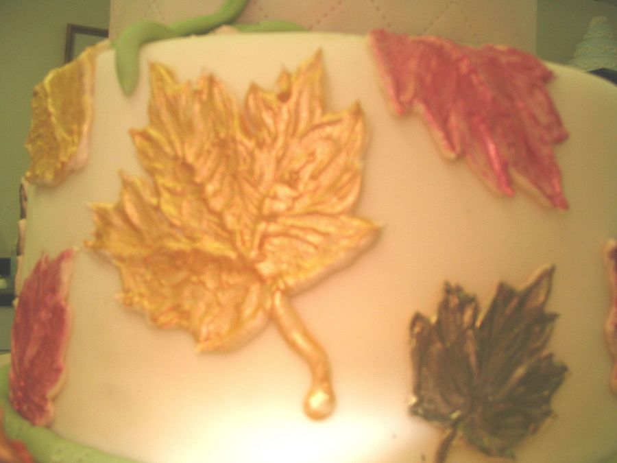 Fondant colored cake made in Fondant and Gumpaste class taught by Collette Peters at Wilton in Chicago. Dummy cake. The leaves are gum paste airbrushed with various colors. There were also nuts and berries out of gum paste. This was the first time I worked much with fondant or gum paste.