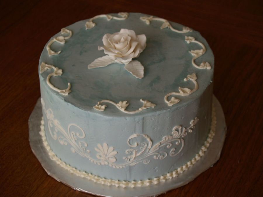I wanted to practice with SMBC and try a gumpaste rose... I made this for a friend's anniversary. I used a stencil on the side, but found it harder to do on buttercream than on fondant! I'm pretty happy with my first rose, though.