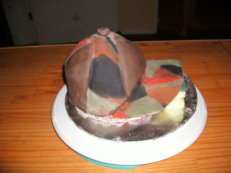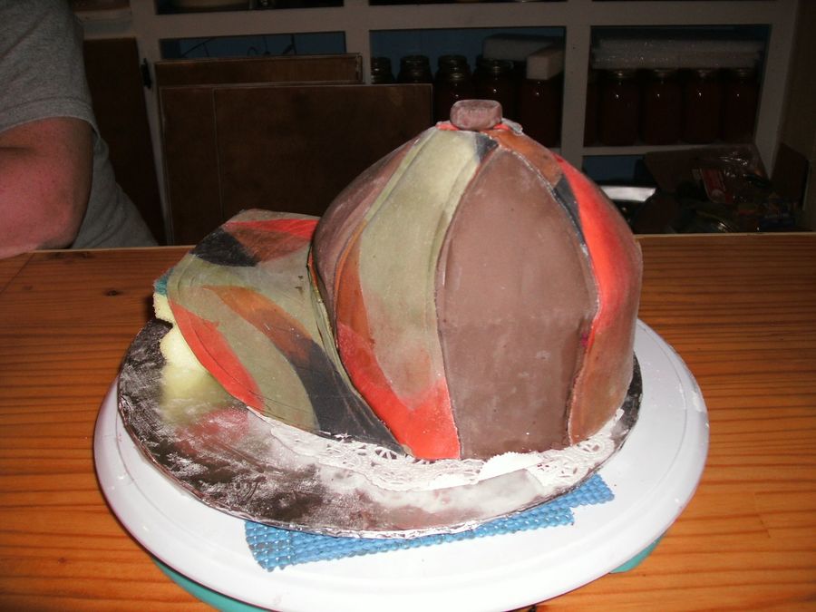 This is my first hat cake. I made this cake my Husbands birthday. It is red velvet cake with homemade marshmallow fondant. The bill of the hat wasn't dry yet so i propped it up with a new sponge.