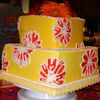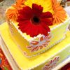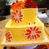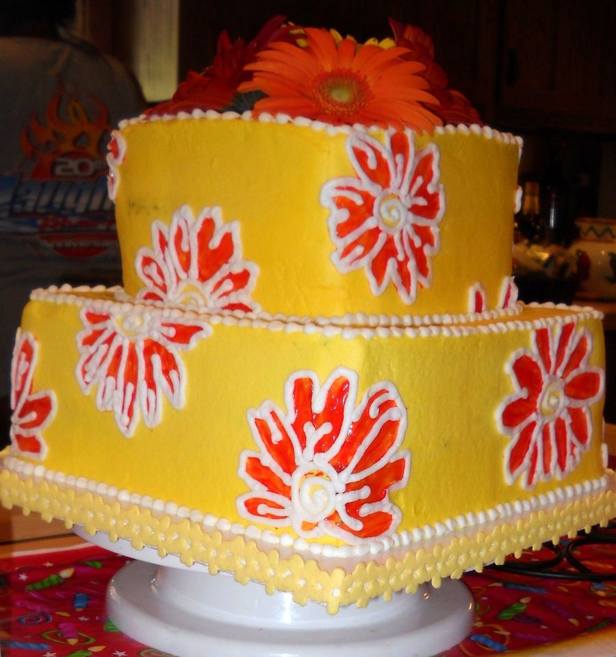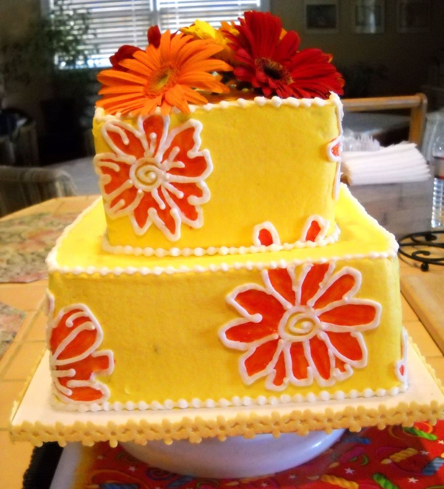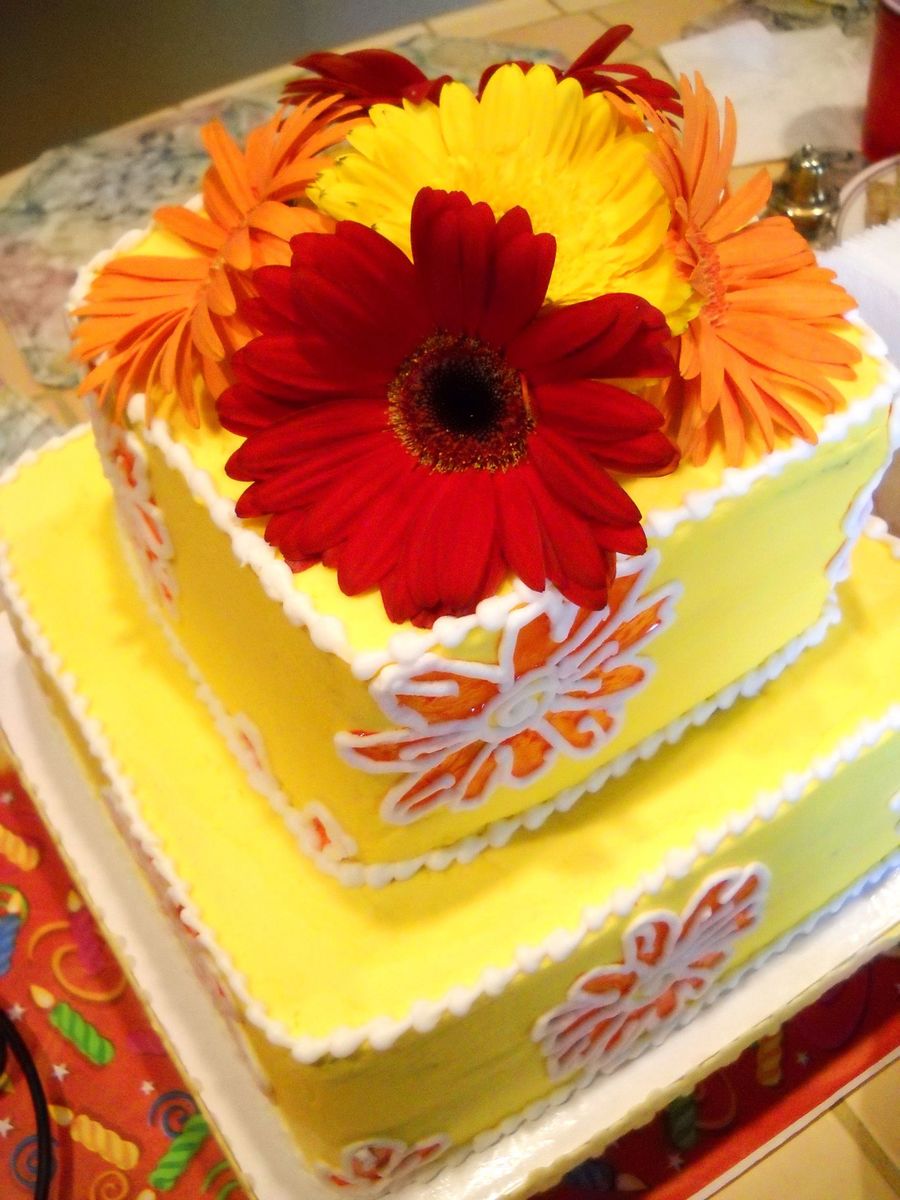 I copied this cake from one here on CC (birdtweet- thanks for your helps), just love the colors for summer. Iced in yellow buttercream with painted on colored gel flowers outlined in white buttercream. Fresh gerbera daisies on top, yellow flower felt ribbon hot glued around the base. TFL!