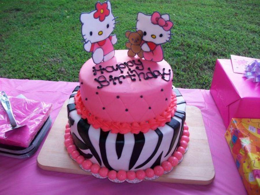 This was for my daughter's 5th birthday! Bottom tier is yellow cake with chocolate ganache, chocolate bc filling. Top tier is WASC with white chocolate ganache and raspberry filling. "Hello Kitties" are RITs, both tiers covered in fondant and all other decorations are fondant and royal icing. TFL!