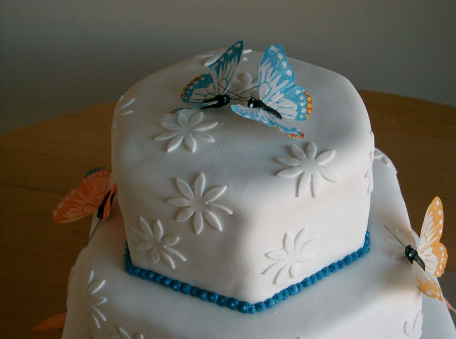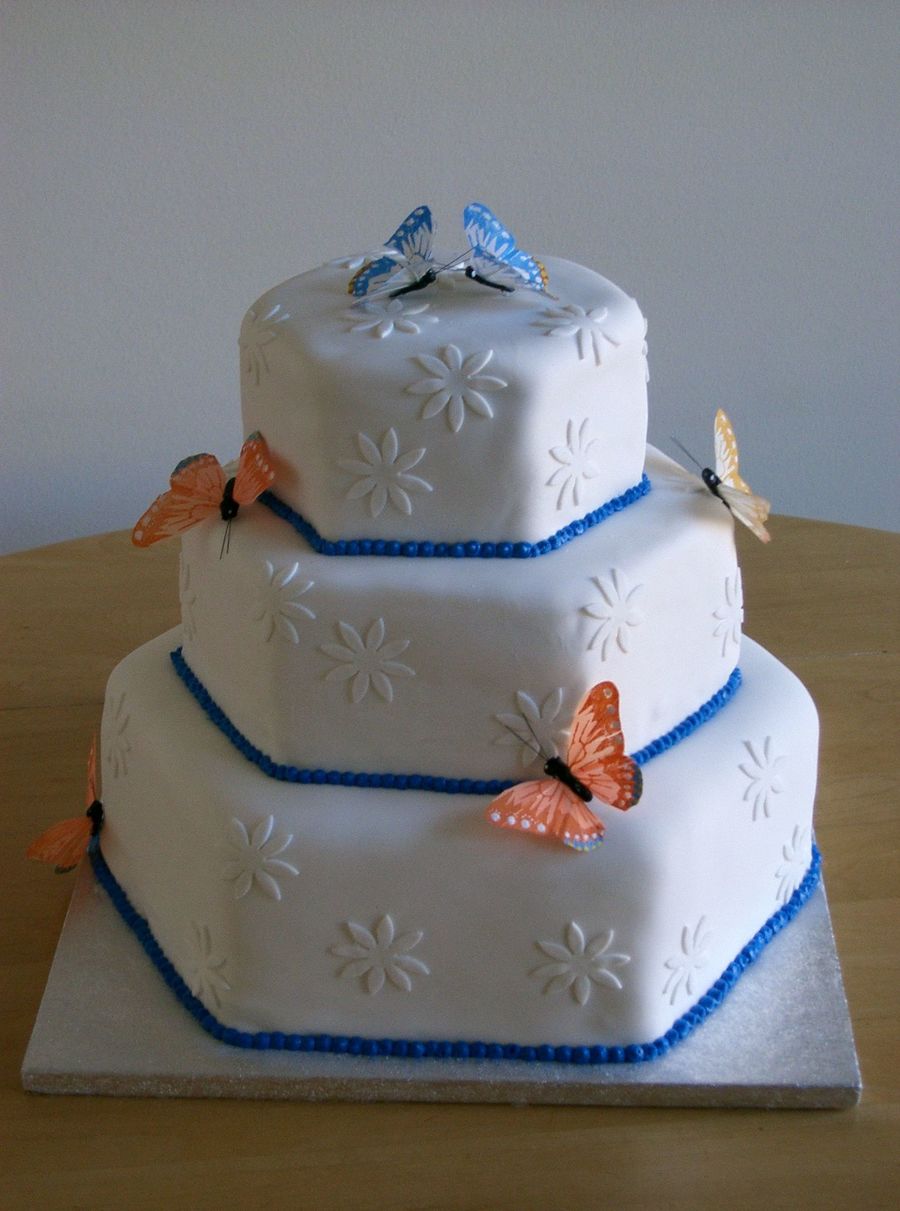 My friend and I collaborated on this wedding cake. Since she is a professional baker, she made the cakes (bottom is choc w/ strawberry filling, middle is banana with peanut butter filling and the top was strawberry cake w/ chocolate filling). Being that this is really my first time working with fondant (other than my Michaels course 2 years ago), I was very happy with the outcome!