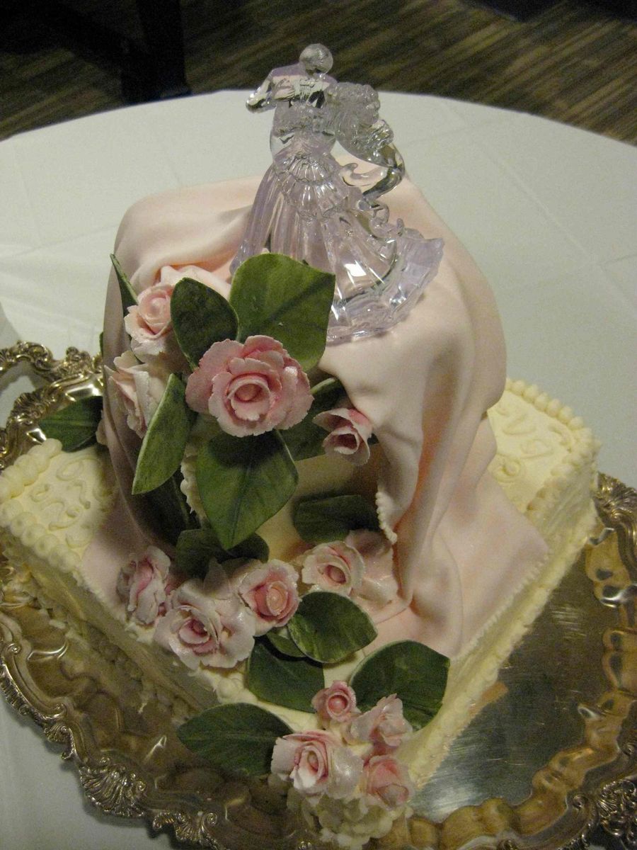 This cake evokes Victorian Era romance. Sugarpaste roses and fondant drapery embellish this chocolate cake with ganache filling.