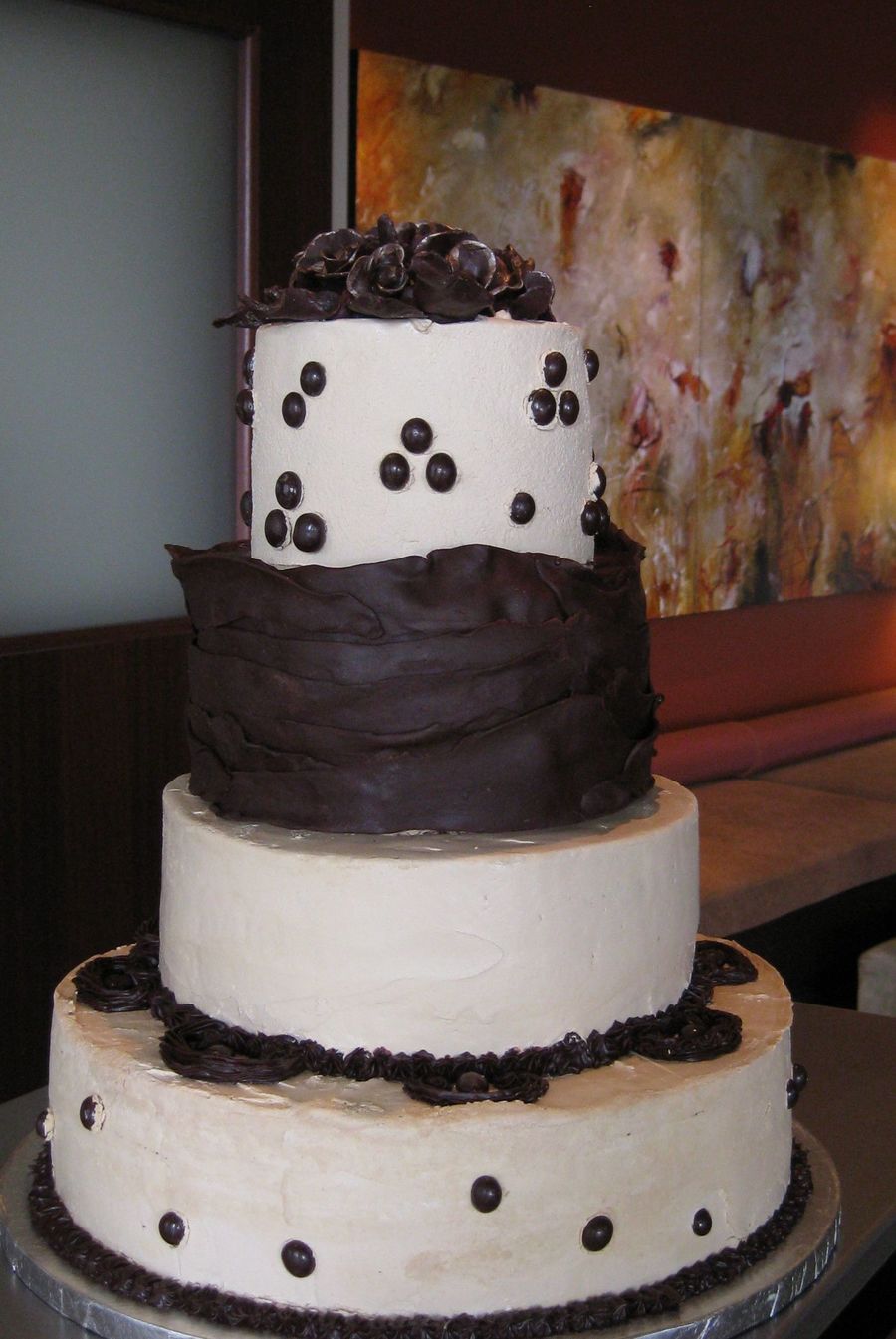 This cake served 150 guests attending the grand opening of a twin-tower, high-rise condo/retail project in Bellevue, WA. The cake was chocolate espresso filled and iced with espresso buttercream.