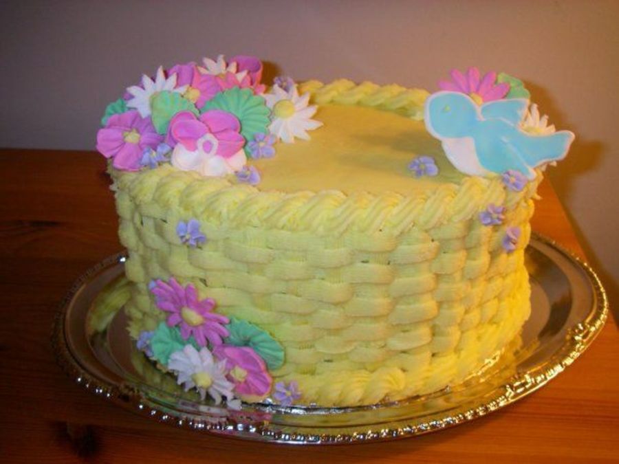 Cake I made for the final class in Wilton Course 2, my first time doing the basket weave and using royal icing accents. I found the silver tray at the dollar store, it was the perfect size for the oval cake pans!