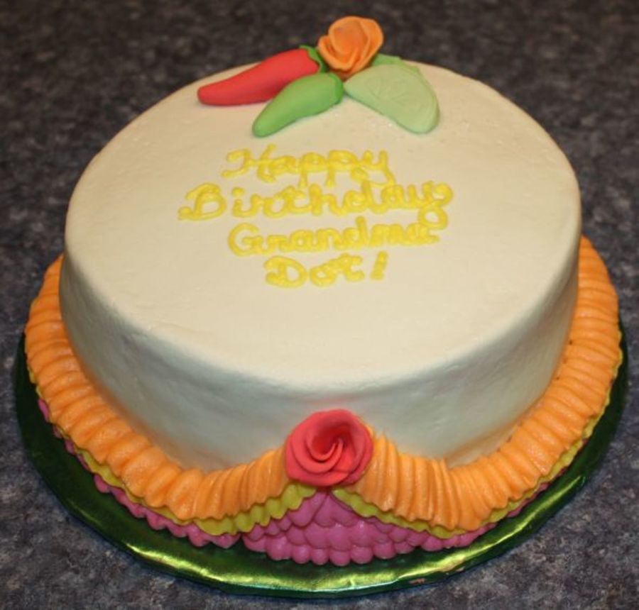 Fiesta Birthday cake for a coworkers Grandma. Had a disaster - the ruffles pulled the icing off the side of the cake after it was done. I had remove the ruffles and the sides and repair it (left the top on). Turned out ok I think in spite of the repair - buttercream isn't smooth like I wanted. I used bit and pieces of many cakes I looked at to settle on this. It's margarita cake with margarita buttercream and lime curd filling.