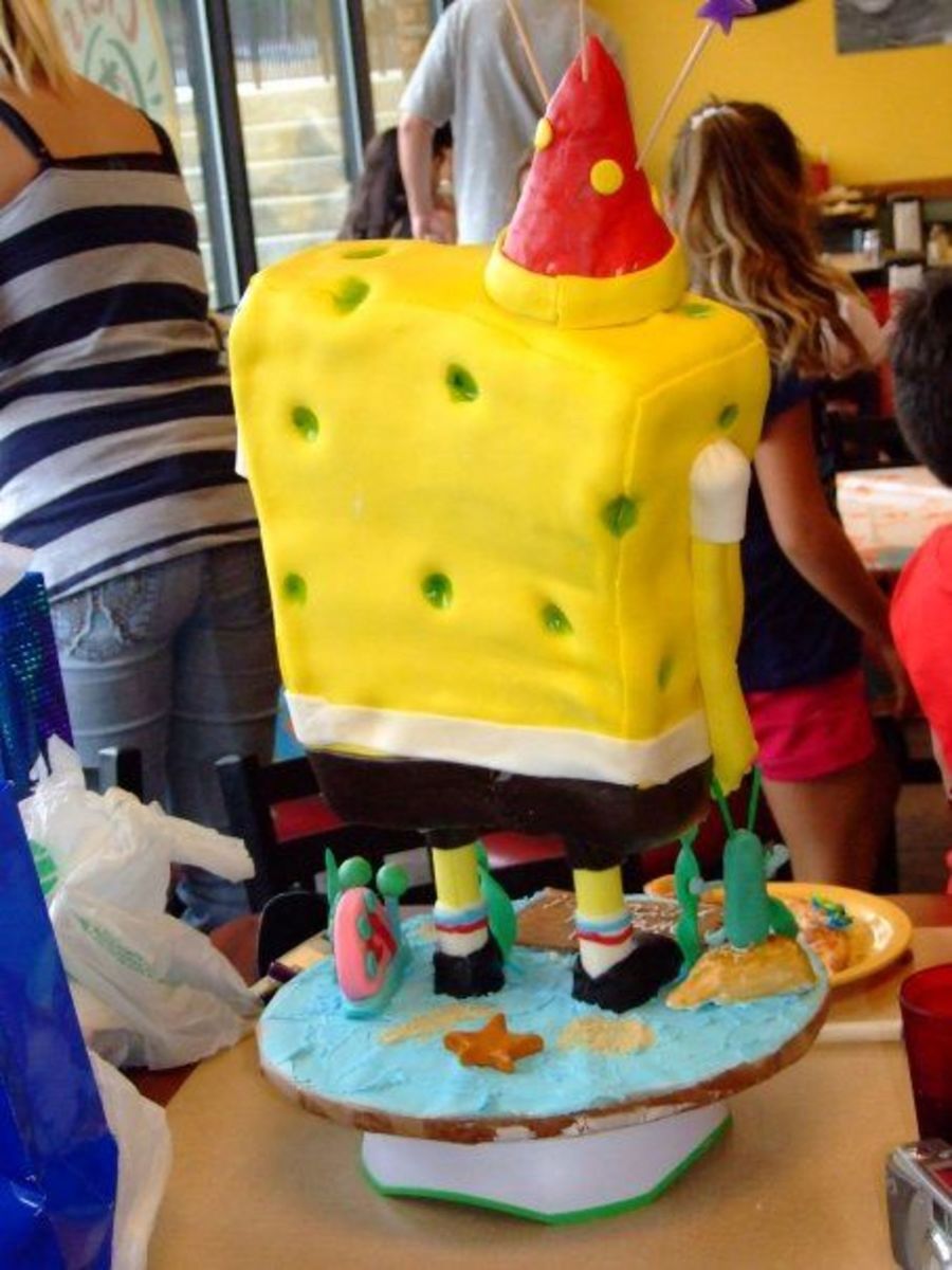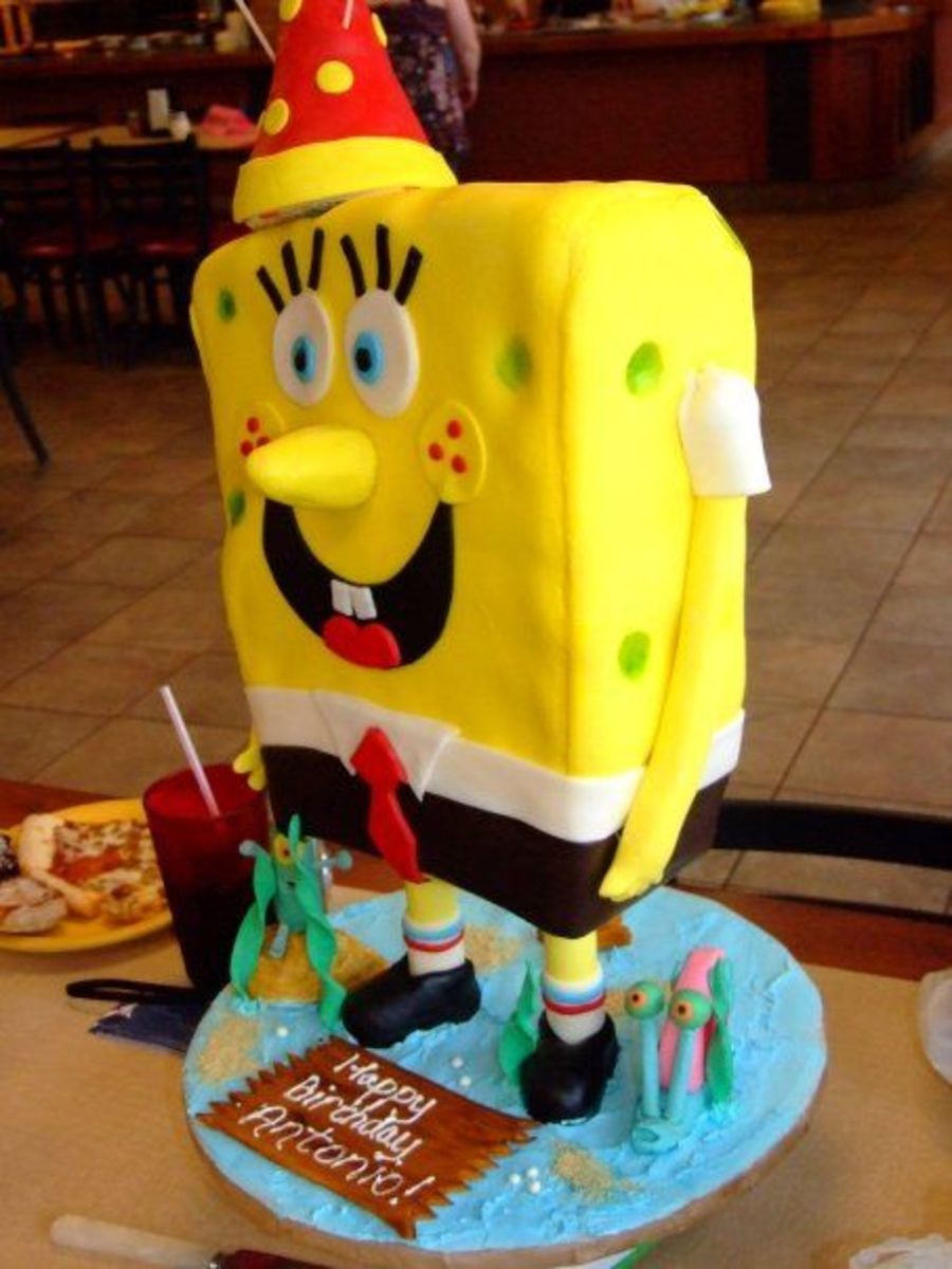 Standing Spongebob. This cake was definitely a learning experience, LOL Layers inside are alternated with butter and chocolate cakes. Buttercream icicng and filling covered in fondant with fondant/gumpaste decorations. Hat is RKT covered with fondant. TFL