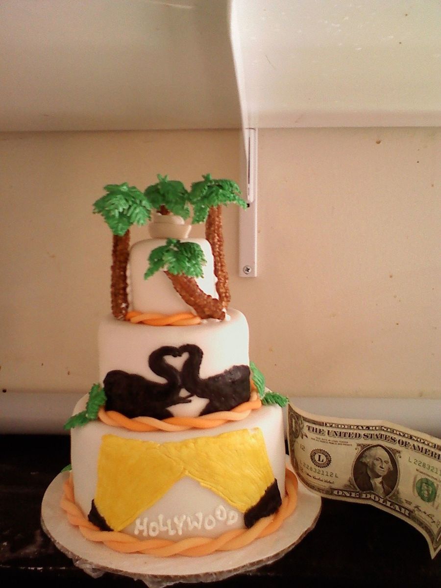 My sister got married on a cruise and I made this cake for her when she got home. It is personalized to her and her husbands likes. The bottom is spotlights because he would like to work in Hollywood, the middle is because she loves elephants (silhouettes) and the top is for the cruise they got married on. The trees are royal frosting. the dollar shows how small the cake is.