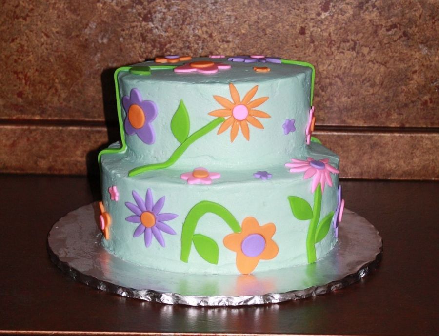Flower cake for a 7 yr old girl who only said she wanted blue, purple, and green. The rest was up to me and her mom. Done with inspiration from a cake on this site. All buttercream with fondant accents. Mom of the girl made the cakes and the icing. I was challenged. :)
