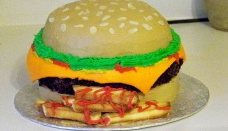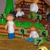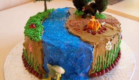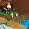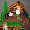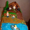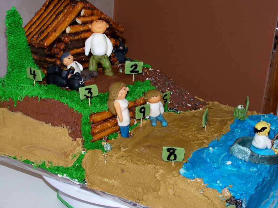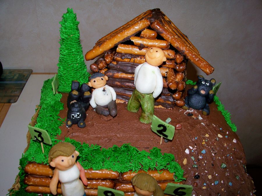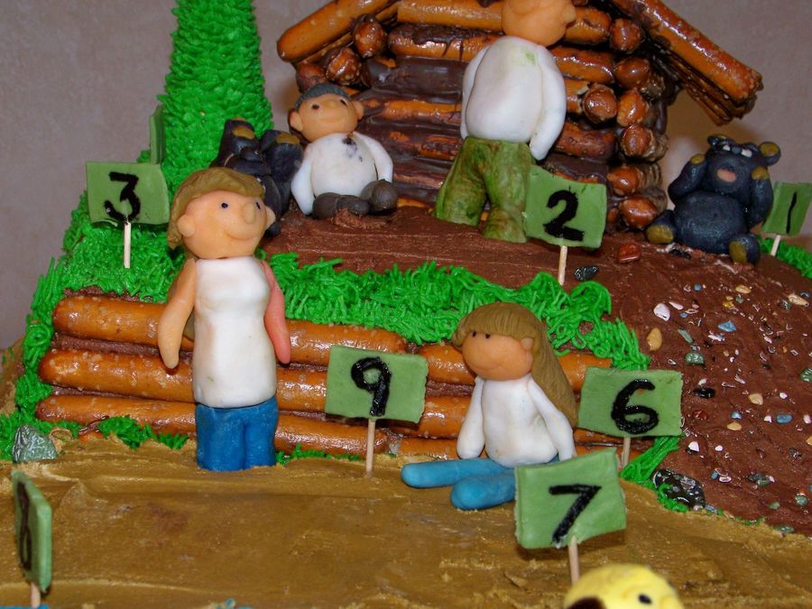 A 12x18 with a 9 x12 on top, pretzel log cabin, gumpaste people, chocolate pebbles, bc everything else. :)