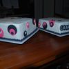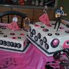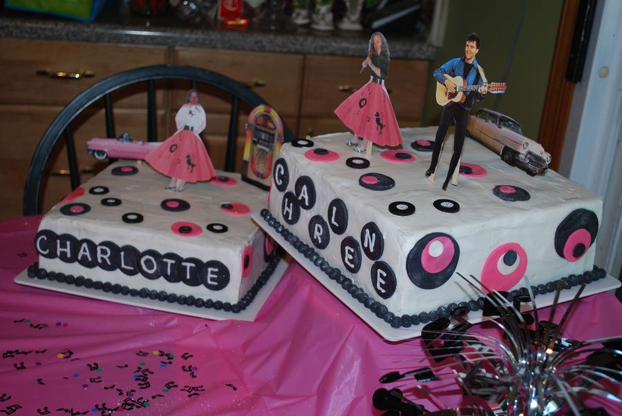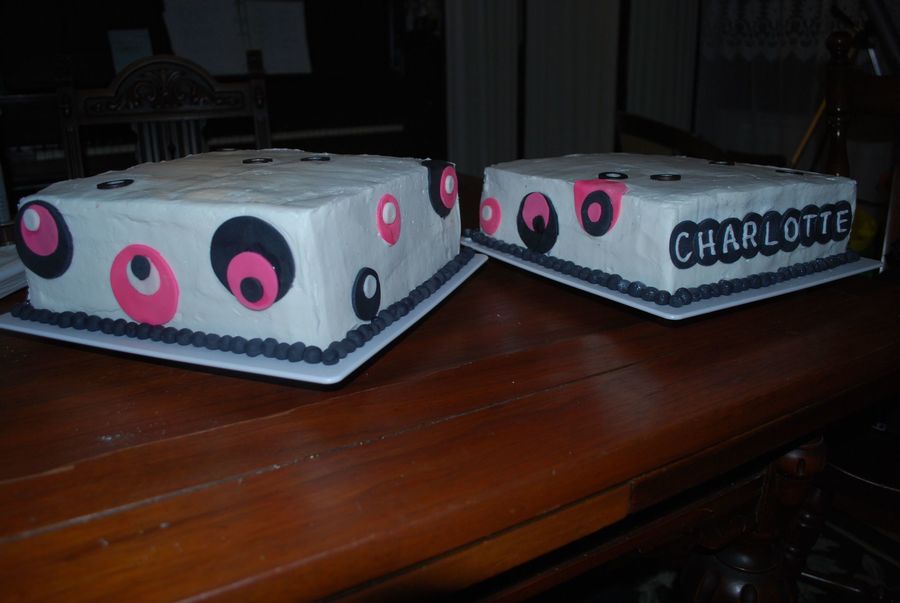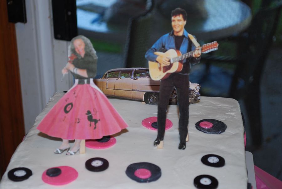 My twin cousin's are in love with Elvis so I made them these square cakes. All the circles were made of fondant and I hand rolled all the balls around the border. I then used a dry paint brush to add sparkling edible dust to all the circles and balls around the border. I bought tiny circles from my craft store, drilled holes in the middle and painted them like records and then wrote the names of Elvis songs on them. I also turned pics of my cousins into paper dolls and put them on the cakes with popsicle sticks.