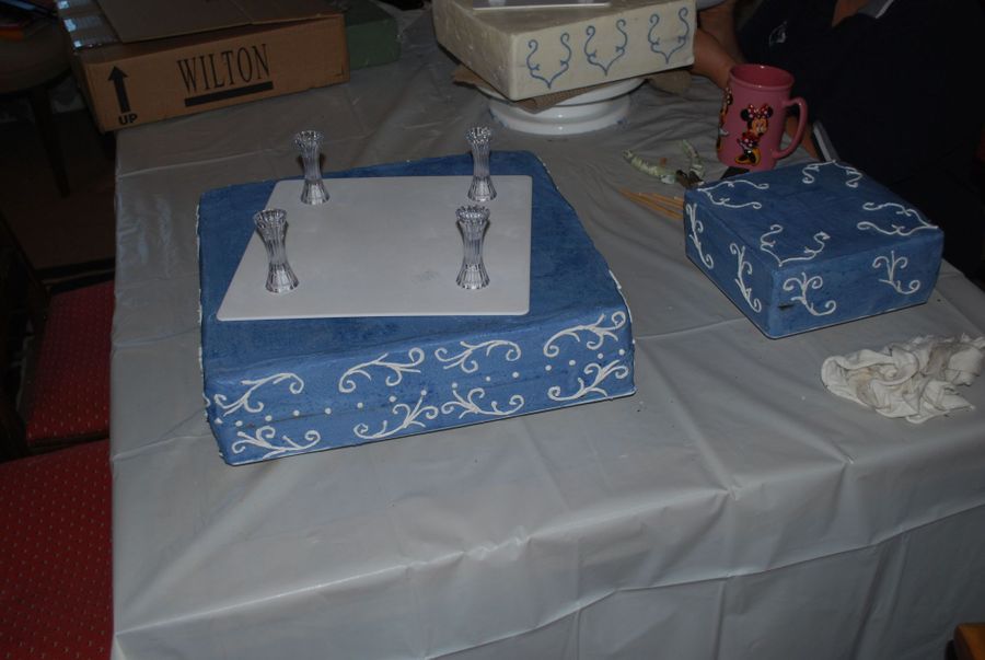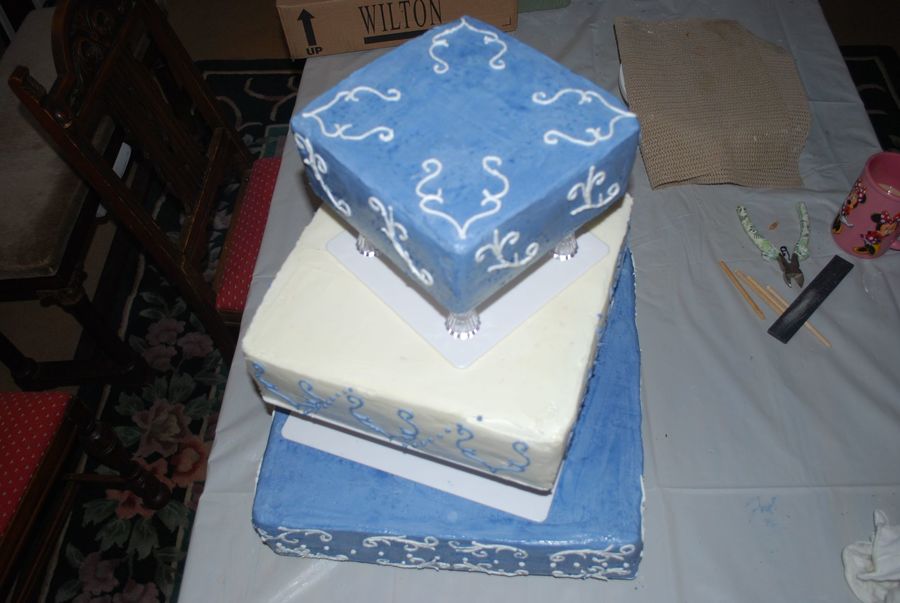 My friend was moving to Italy to pursue his modeling career and so he had a huge party before he left. This is what he asked for. White cake w/ blueberry filling, Chocolate cake w/ white frosting filling and White cake w/ cherry filling. I used the scroll kit from Wilton for the designs and then just traced over the imprints. I used Delphenium Blue for the color