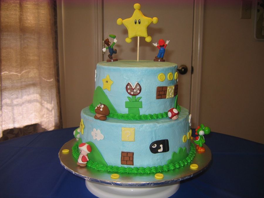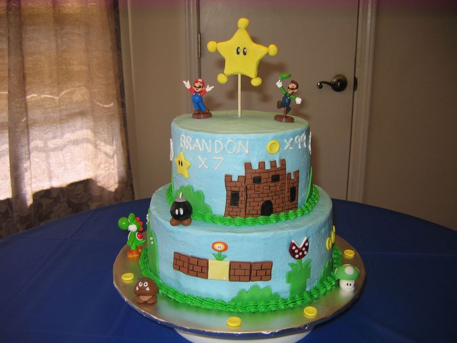 This cake was inspired by several cakes on this site so many thanks to all of you! 7" and 10" round cakes. Buttercream icing with fondant accents. The figures are gumpaste/fondant. This was my first time making figures and I ran out of time so I used toy figures for Yoshi, the red mushroom, Mario, and Luigi.
