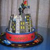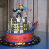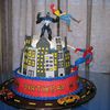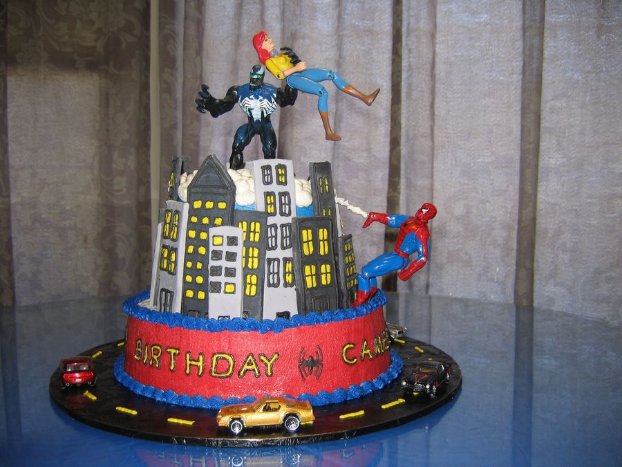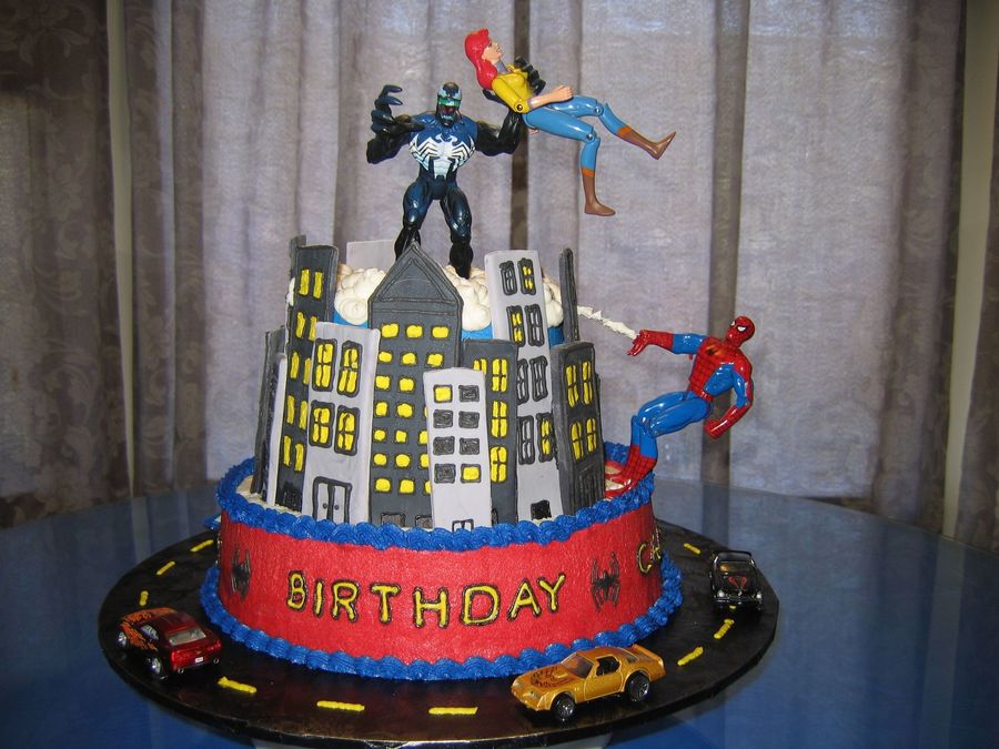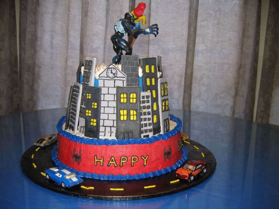 6" and 10" round cakes with buttercream icing. Buildings are fondant with royal icing windows/doors. I used building patterns from a Wilton book for most of the buildings. Toy figures for Venom, Mary Jane and Spiderman.