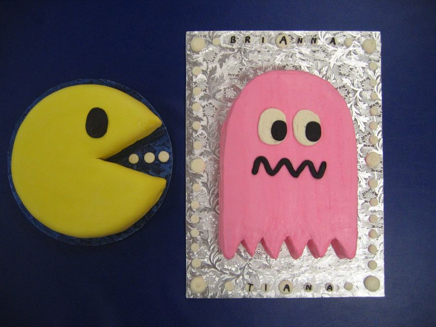 9" round pacman covered in fondant. The ghost was a sheet cake cut to the ghost shape and iced with buttercream. The black part of both eyes and the ghost mouth are fondant.