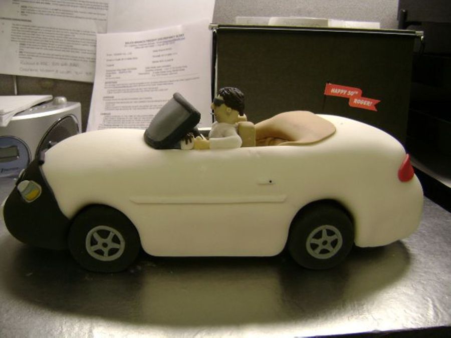 For a friend's 50th b-day. Cake is a replica of his conv. Driver is gum paste. The car is all fondant over white cake