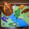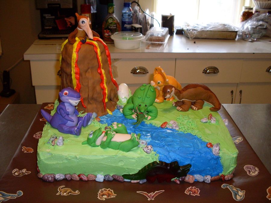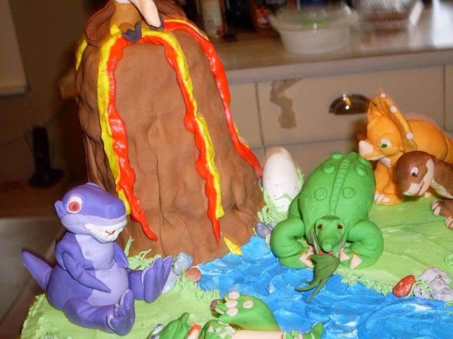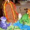fondant dinosaurs with a rice krispies volcano covered in fondant atop a frosted cake with candy rocks and fondant accents