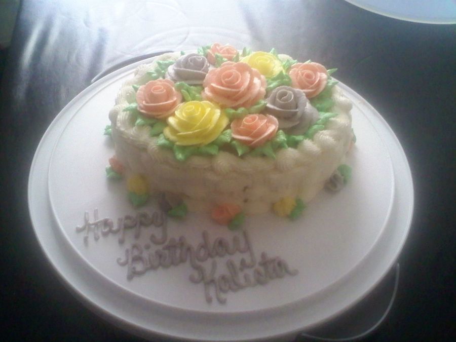 this is a yellow cake with butter cream roses. made this for my girlfriends sister who lives in Ohio and we are celebrating here in Texas without her :(