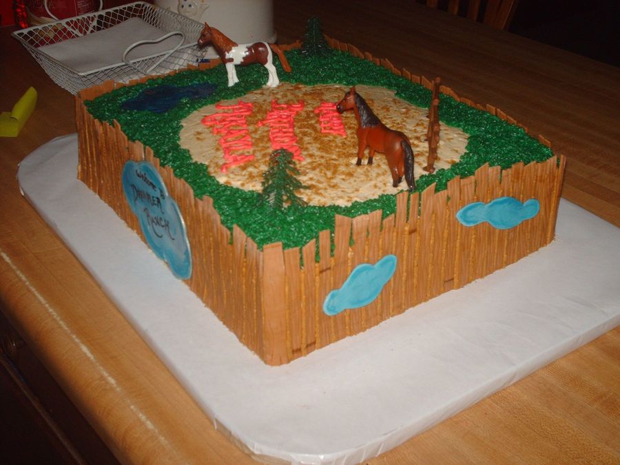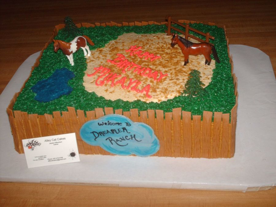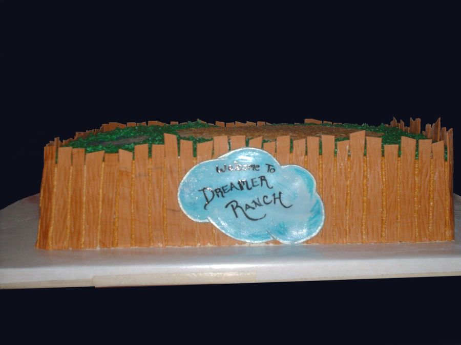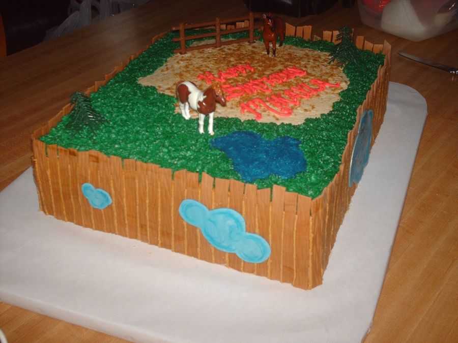 This cake I did for a little girls birthday. She loves horses and her new horse is named Dreamer. Fencing is MMF, grass is BC, water is blue piping gel and the horses trees and small fence on top are plastic toys provided by the childs mother who requested they be used. The horse looks just like 'Dreamer'.