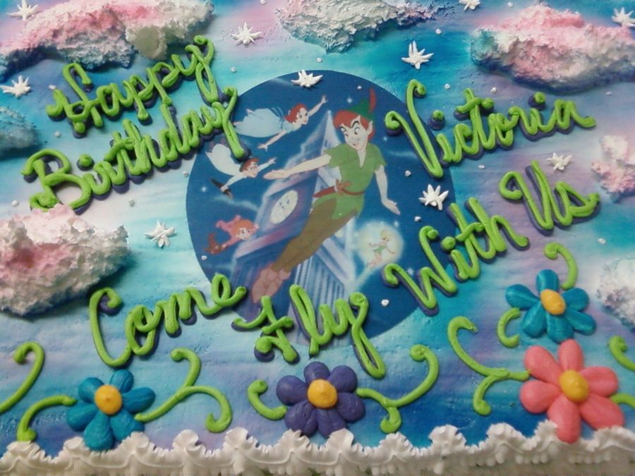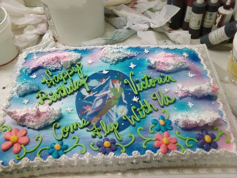 This woman called about 10 times ordering, cancelling and re-ordering this cake. All of us tried as hard as we could to get her to choose a more colorful, pretty Peter Pan picture but this is the one she wanted. I did exactly what she said to do, and I hope she liked it.