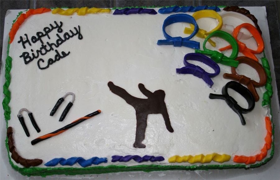BC icing with fondant belt and swirls and choc. transfer karate guy.