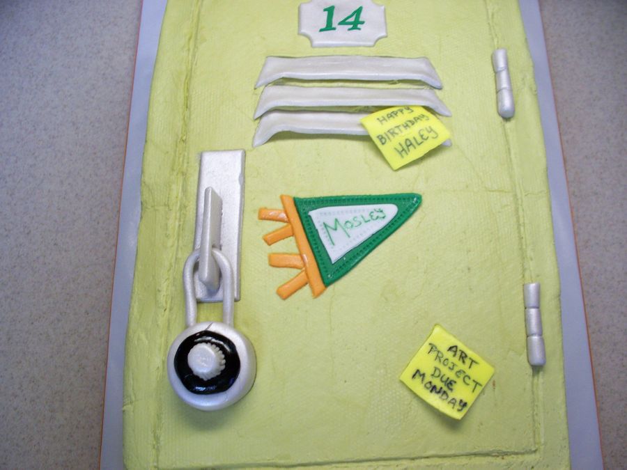This was a birthday cake for my granddaughter's 14th birthday. This is her freshman year and the first time she has ever had a locker so I thought it was appropriate. Double layer 9 x 13 iced in buttercream with fondant decorations.