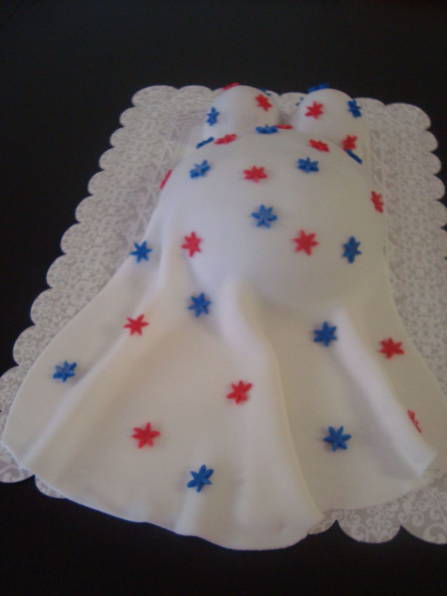 This is my first attempt at a belly cake. There are some things I would like to change for the next time, but I still love it. The them is red white and blue since the party is Labor Day weekend.