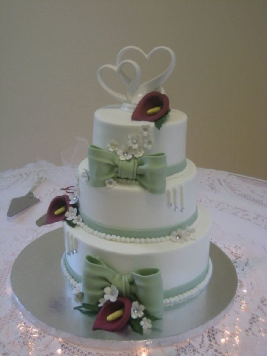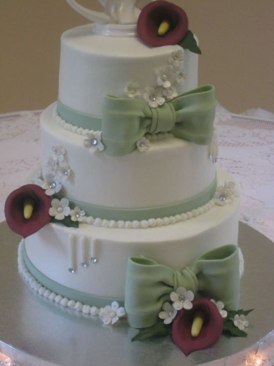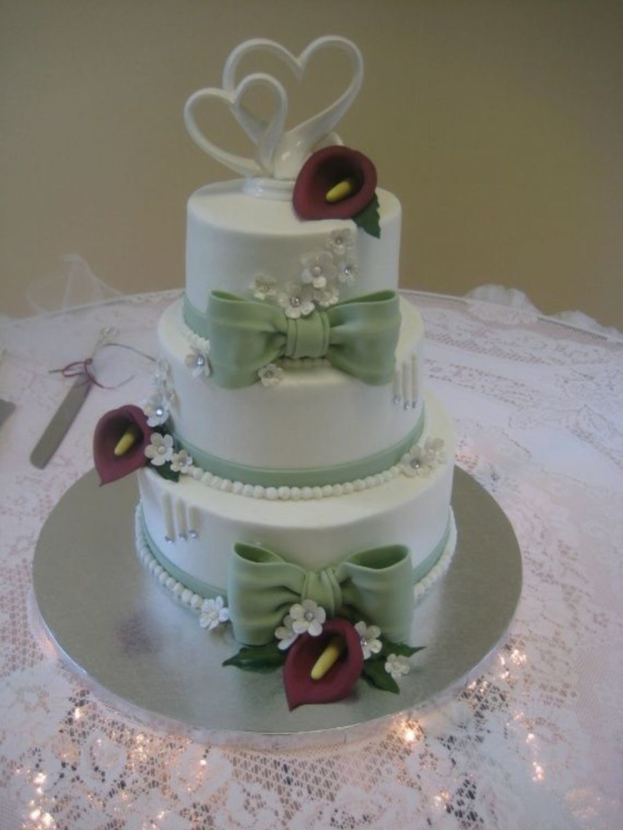 This is the wedding cake I did for my nephew and his new wife, It is Sage & Burgundy 6,8,10 in. rounds, iced in BC with fondant/gumpaste decorations. Thank You to Sharon (Sugarshack) for her Boxes & Bows DVD. Edna (Tonedna) for her youtube video on making Calla Lillies. The 3 lines with a jewel at the ends, represets the groom, bride and a son as a family (I did this on another wedding cake for the same reason) they all love this idea. There are jewels in some of the flowers. Last min. had to change the design of this cake, due to things just not working out, but in the end it came out better then the other design. Bride & Groom were very happy with it. TFL God Bless, Sharon