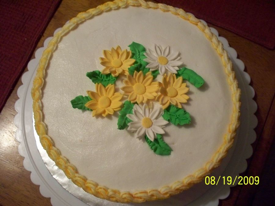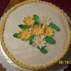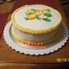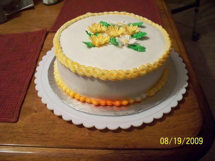 Class practice cake. White buttercream with yellow borders. The cake was yellow and had lemon filling. Family liked the combination of colors.