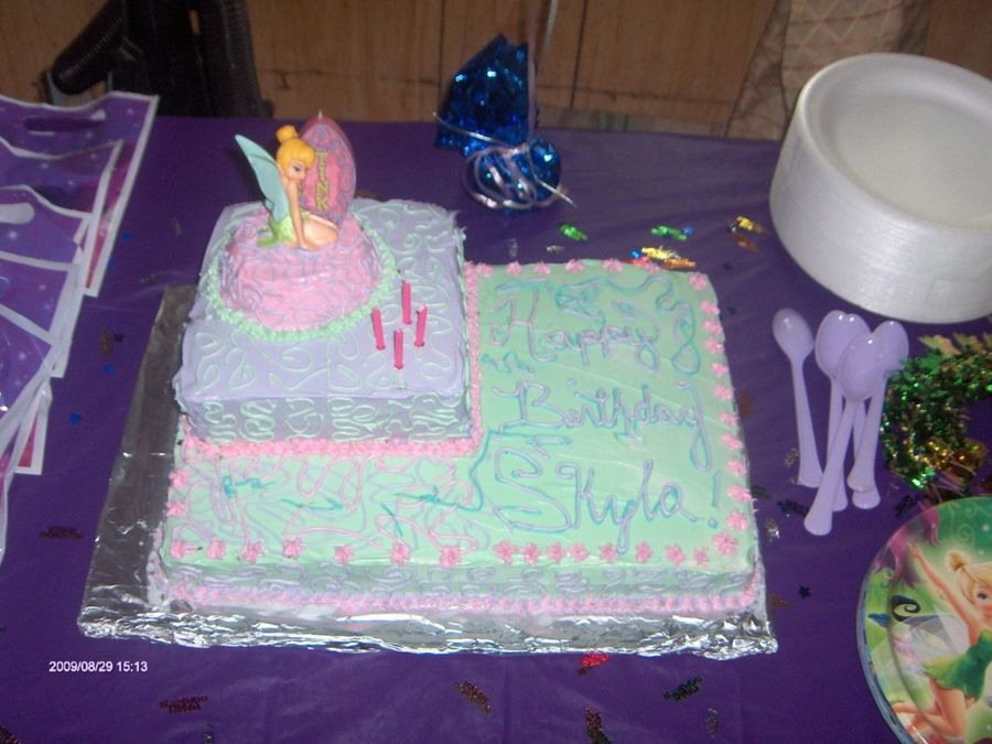 This cake i made for my neices tinkerbell party. Just something quick and easy, she wanted a pink, purple, and green cake so thats what she got. i tried to incorporate the candle design onto the sides of the cake and on the tops of the cake. its not what i expected but she absolutely loved it.