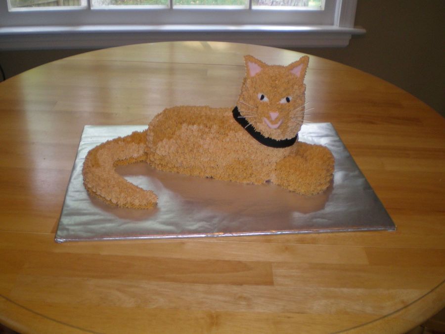 Our adorable orange cat, Cody, was a willing model. This was a pound cake made in the 3D lamb pan. He's covered with star tips only because I didn't have the hand strength to make fur. The tail and paws are solid fondant.