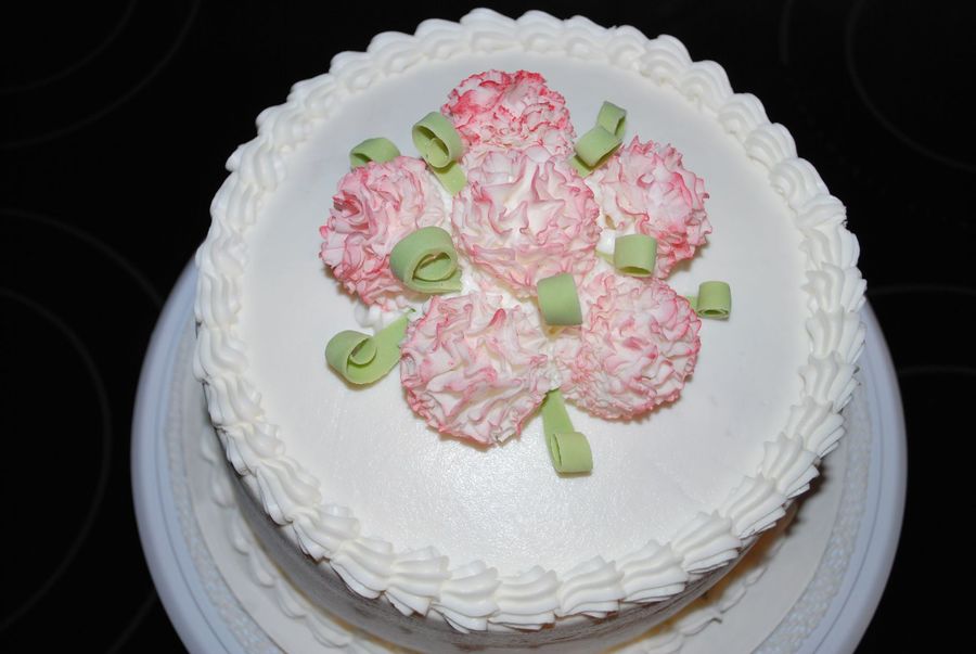 Anniversary cake I made for my parents. My mom loves carnations so I thought I would put them on the cake. One layer yellow cake for her and a peanut butter chocolate layer for my dad.