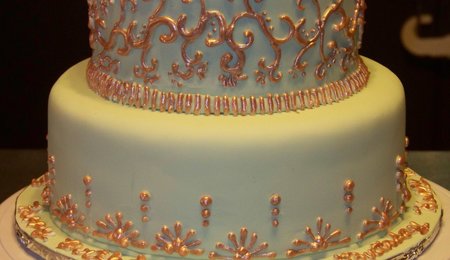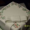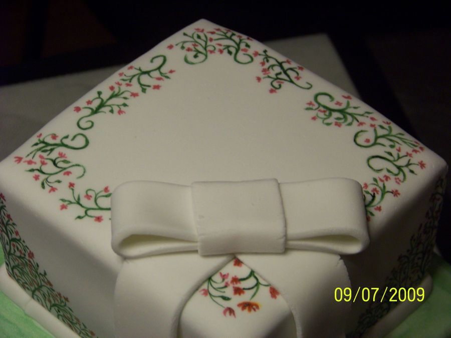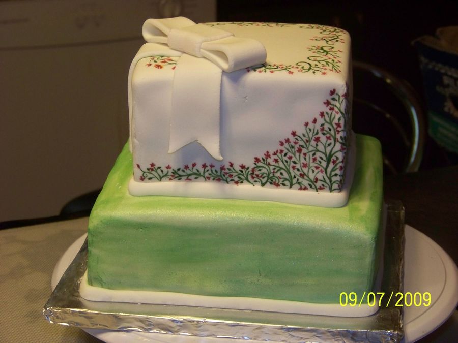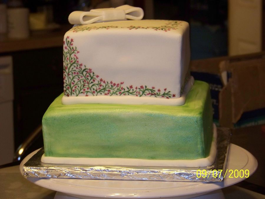 I needed some cake therapy. Plus I wanted to try out some new fondant techniques. Hand painted top tier, and green pearl dust on bottom. Fairly sloppy fondant bow....I was tired.