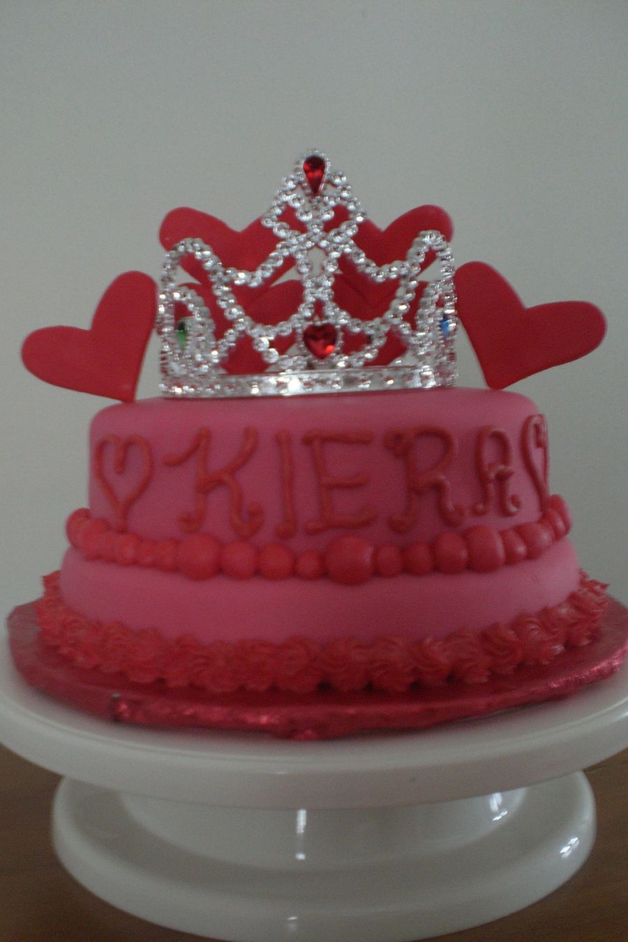 A b-day cake for a three year old cousin. She requested pink with red hearts so this is what I came up with
