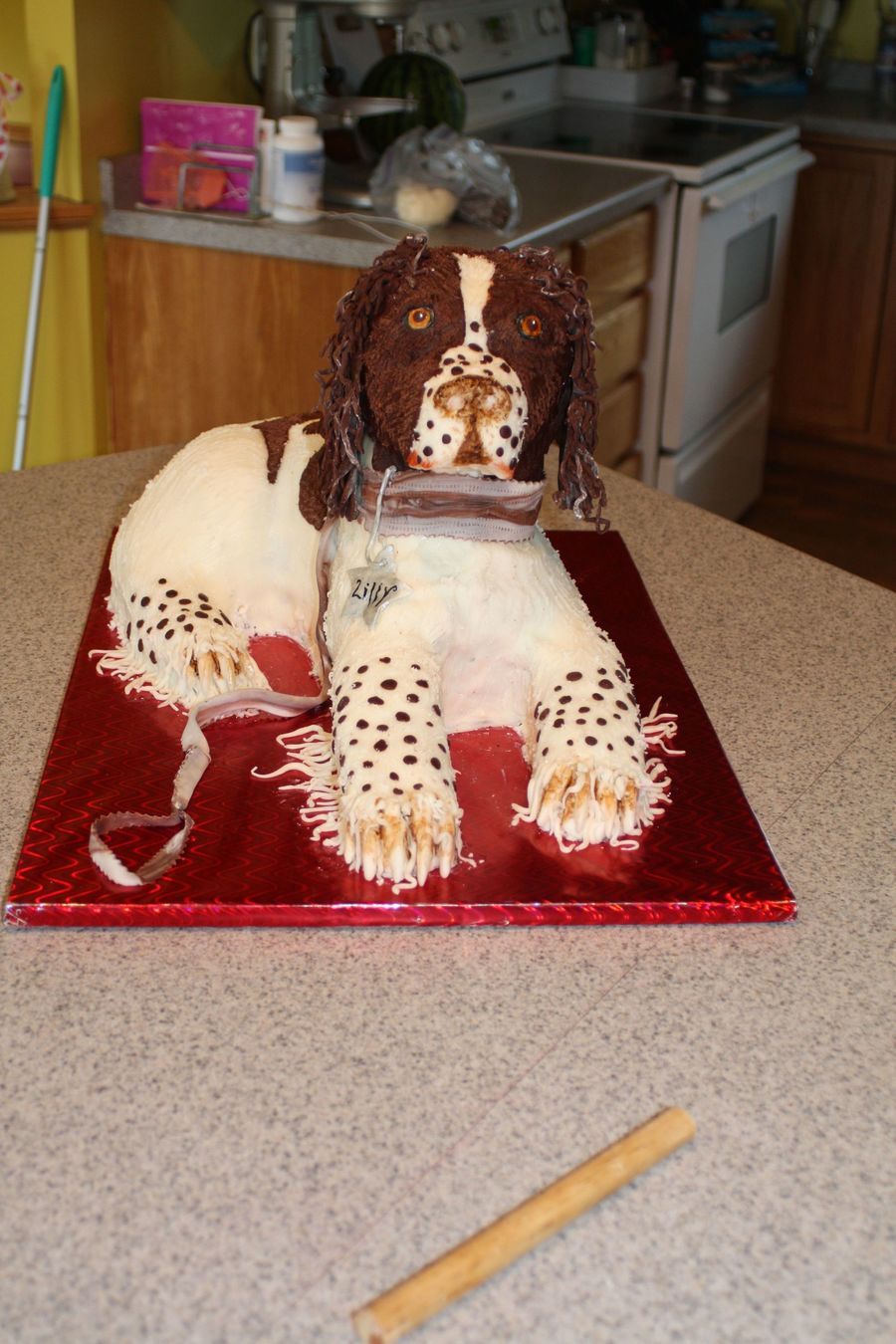 My first carved animal. Lilly is a lemon chocolate with chocolate, hazlenuts and buttercream filling. She is covered in all modeling chocolate with a rice crispy head, which did not want to stay on. Swore I would never do another, who knows, like child birth after a while the pain goes away! A big difference from the first cake I baked for my father 2yrs ago to now. A big thanks to CC>