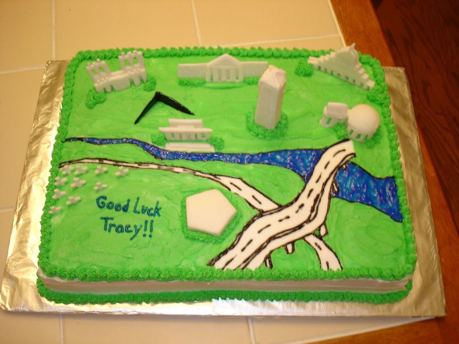 This cake shows the National Cathedral, Arlington Cemetary, the Vietnam Memorial, the White House, the Capital building, the Petagon, the Washington, Lincoln and Jefferson Memorials, and the Potomac River. All momuments/memorials are made from fondant.