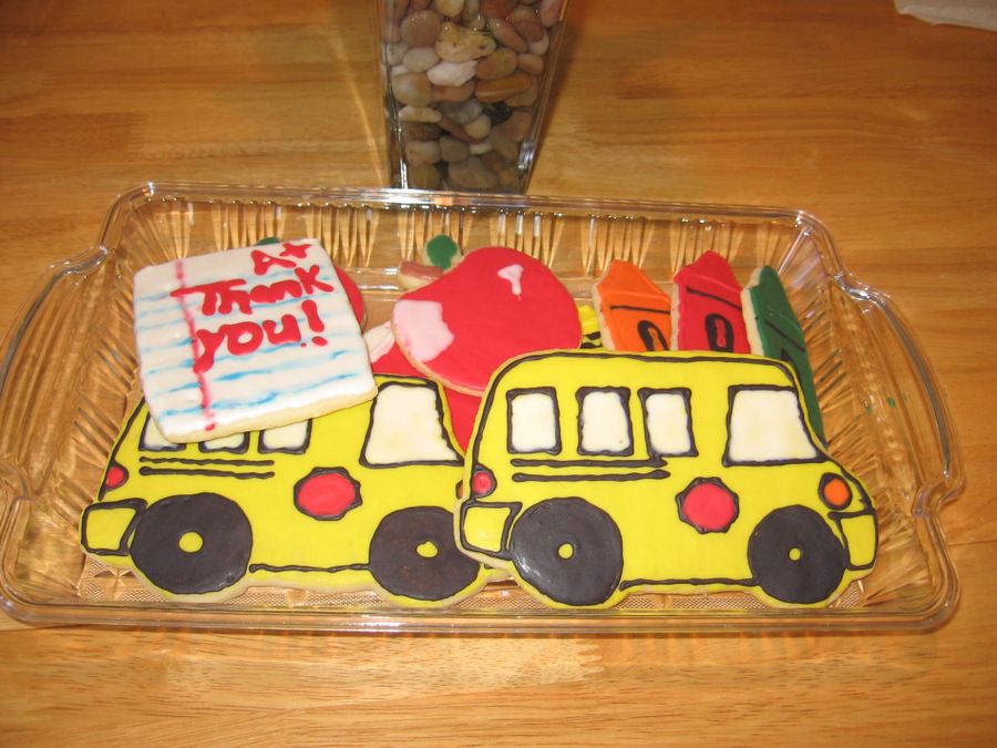 I did these in May for all of my son's teacher's, they were fun, school bus decorator set from Karen's Cookies(love her kits). Inspiration for the rest from the awesome cookie artist here. NFSC w/ Glace icing.