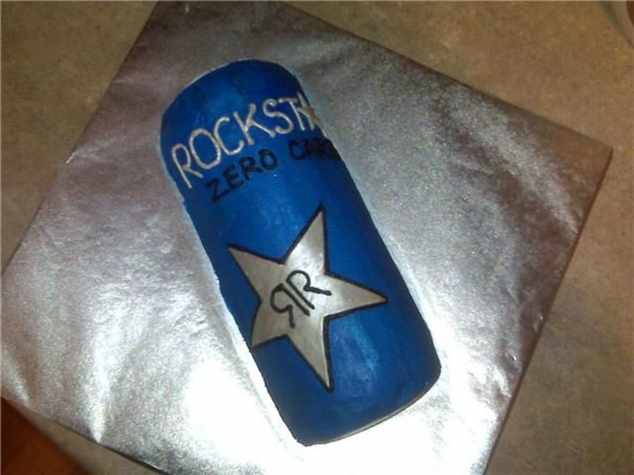 Made this for my friends boyfriend who loves Rockstar energy drinks. I used a 4' round cookie cutter to cut circles out of a square cake; cut the circles in half then stacked them cut side down on board. It was French vanilla cake with caramel and chocolate ganache filling iced in butter cream. Fondant star, silver "lid" and bottom of can, although you can't really see them that well. TFL!