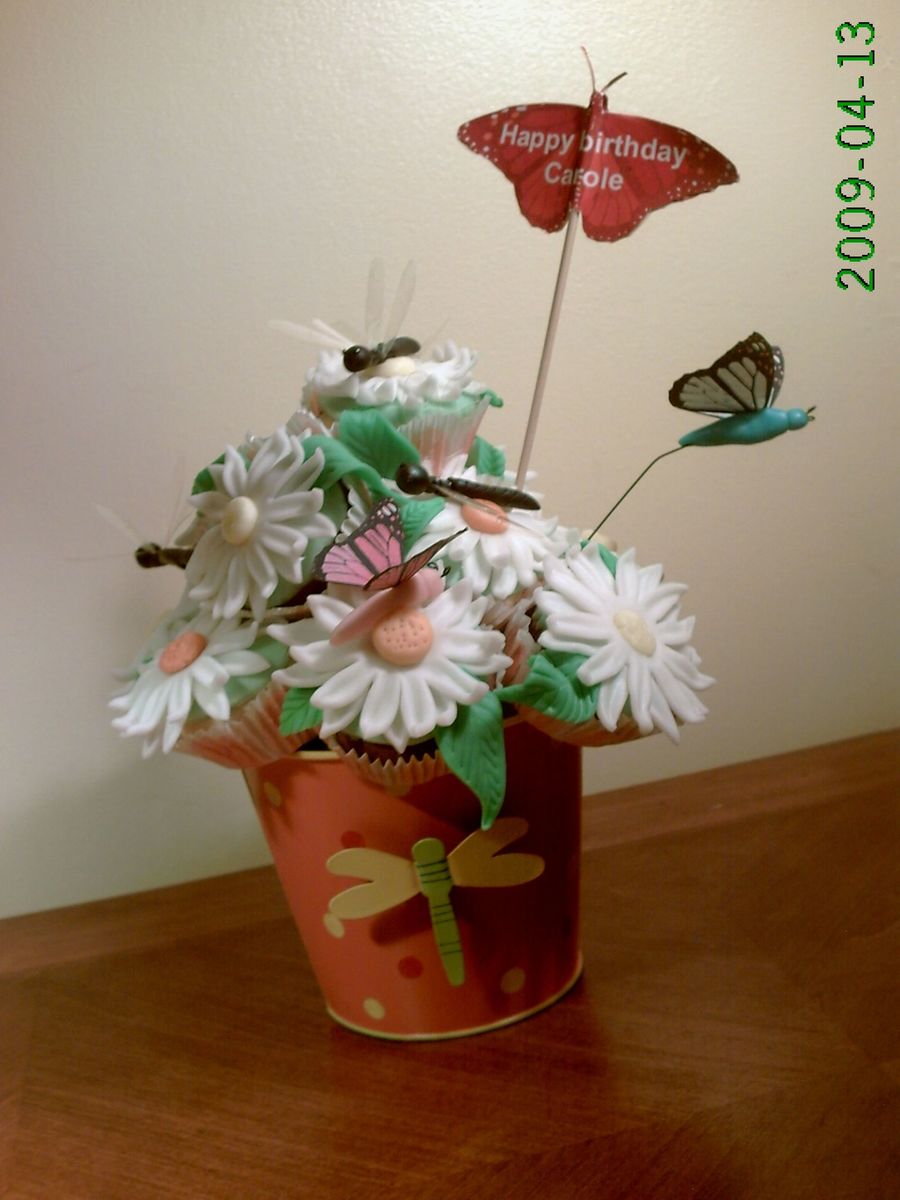 chocolate and vanilla cupcakes with strawberry filling, Dragonflies, butterflies and daisies are fondant,
