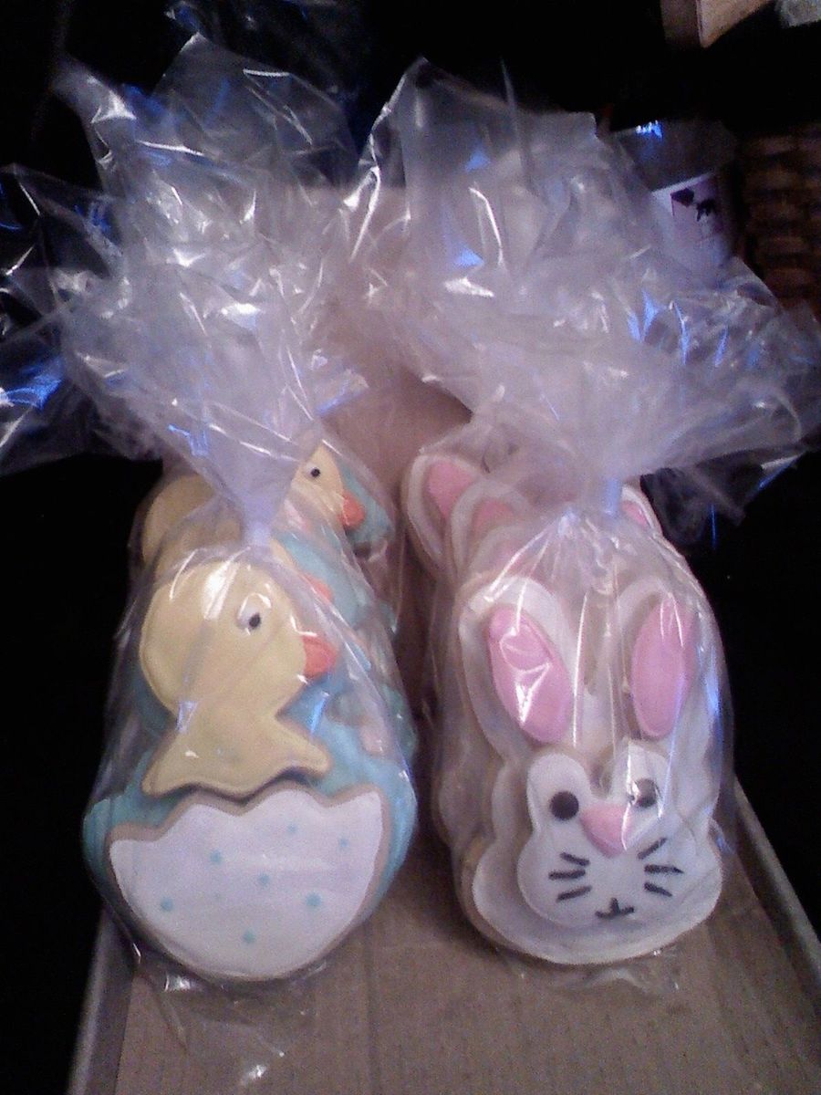 bunny and chick 3D cookies I made for an Easter egg hunt I had. they are about 5 in tall and a little over half an inch thick total.