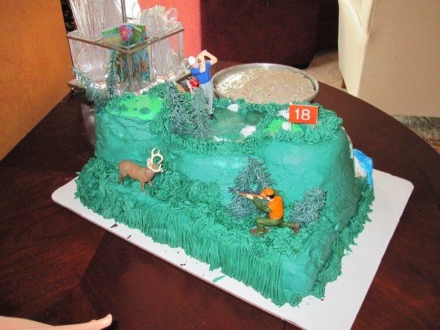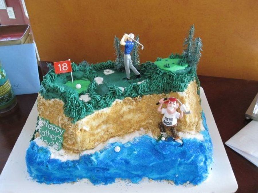 Father's day cake for mostly golfers, but one hunter, too, so we did both scenes. All BC - Sand is graham crackers with sugar and water is blue sugar. I did use purchased toppers for people, though!