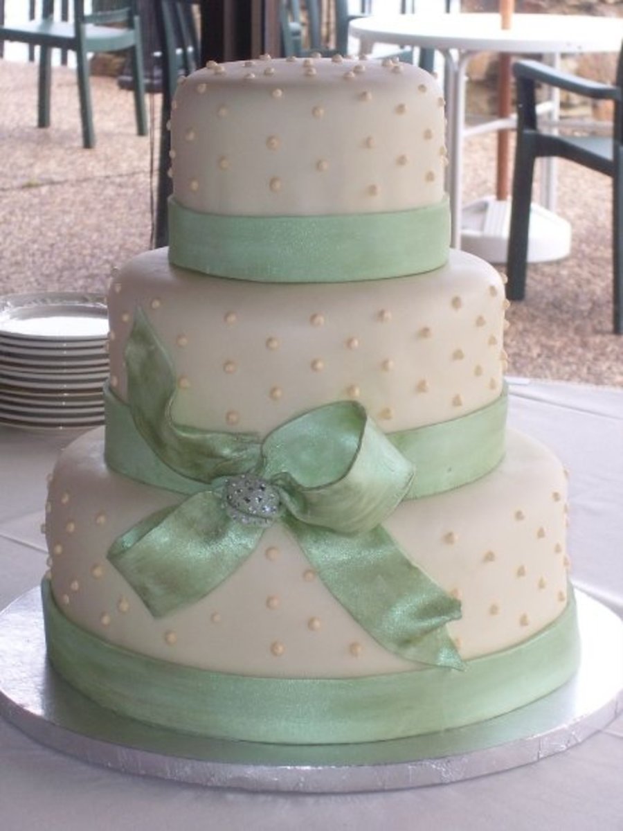 Vanilla poundcake with white chocolate mousse filling and white chocolate fondant. Fondant ribbon and bow brushed with luster dust.