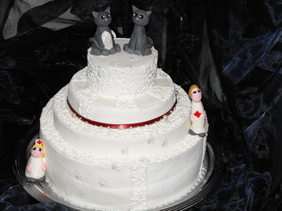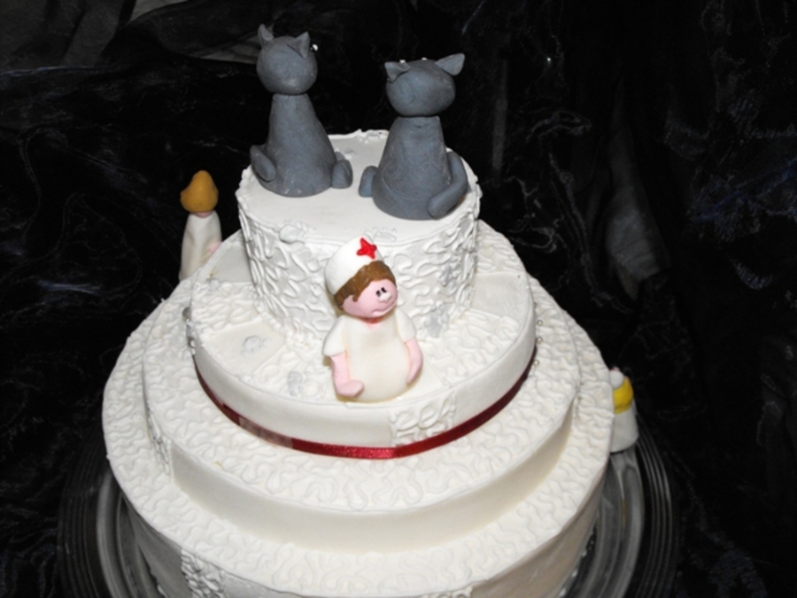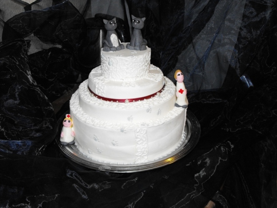 its a cake from nuts and vanillecream...covered with fondant and icing...the bride is a nurse then the wish was a cat and nirse wedding cake...