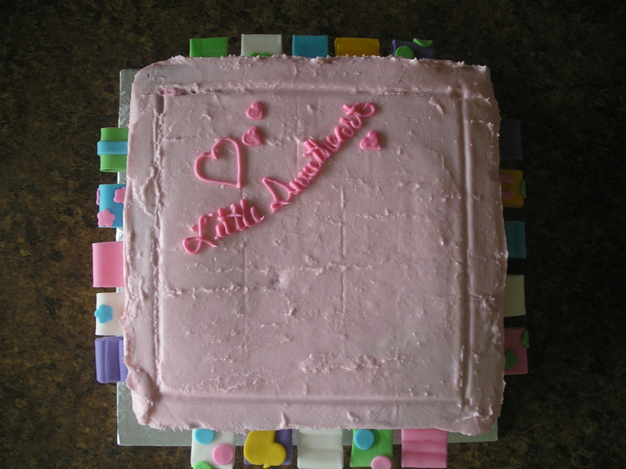 I made this cake for the girl next door who is obsessed with her taggies blanket. The cake is iced in buttercream and the tags are made out of fondant