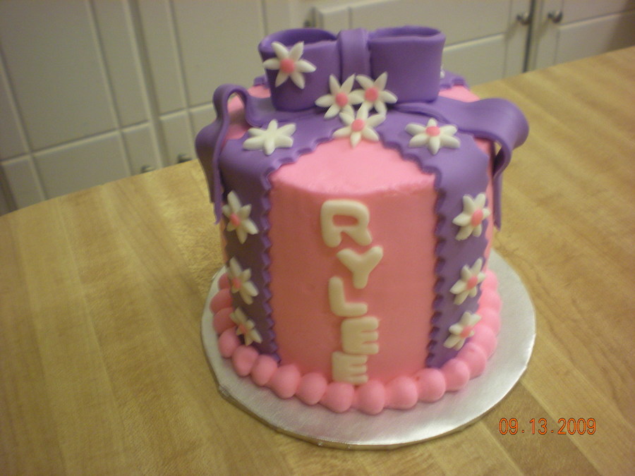 This is one of the triplets cakes. The girl likes the colors pink and purple and likes girly stuff. This is what i came up with.