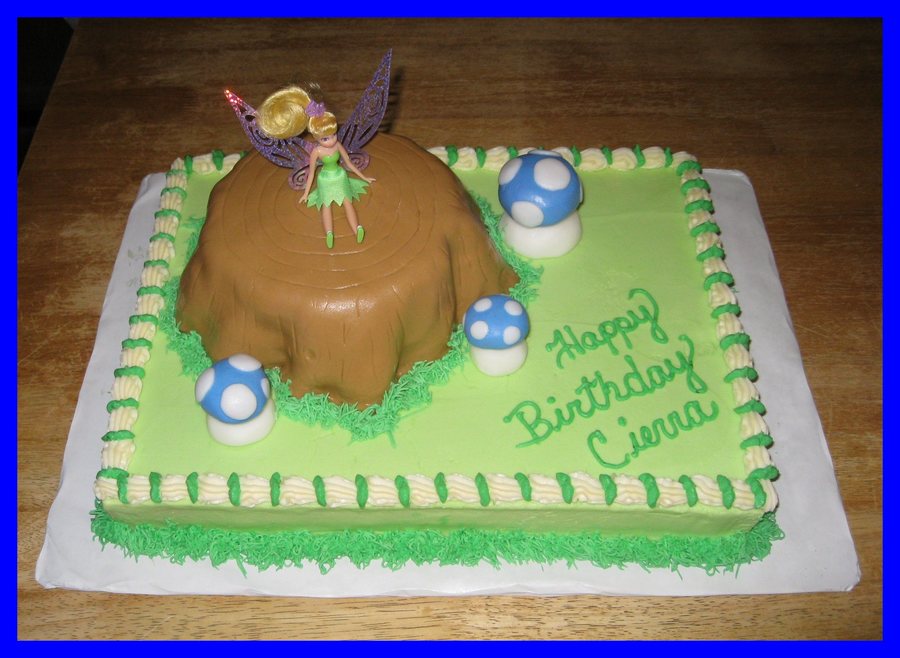 White cake with buttercream icing and Fondant. Tinkerbell is a doll bought at Wal-Mart. Everything else is edible.