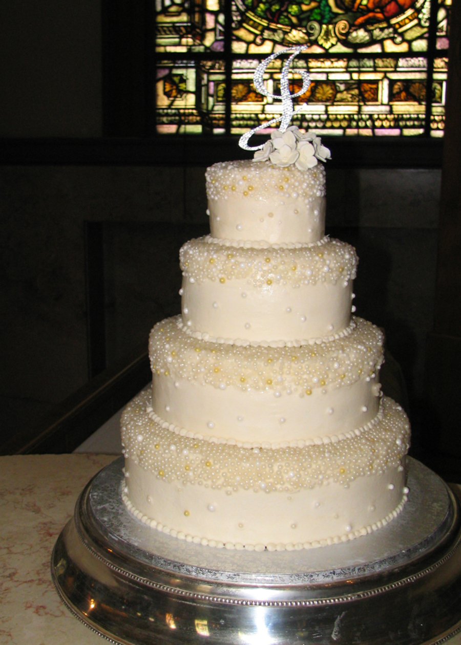 5/8/11/14 ivory BC icing and dragees. sugar hydrangeas on the top. thanks for looking all comments appreciated!