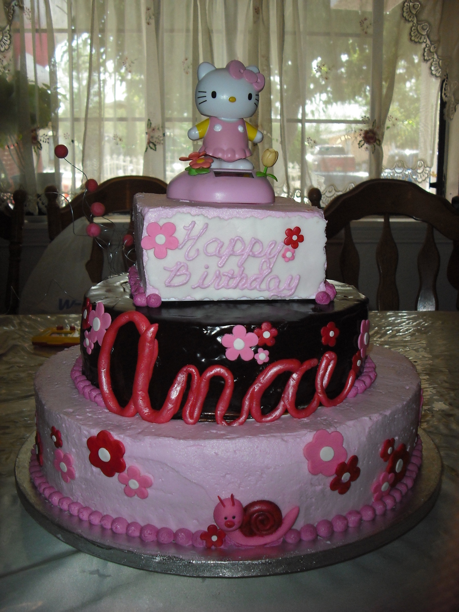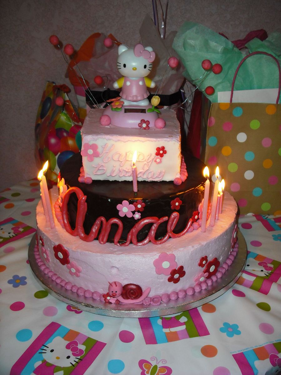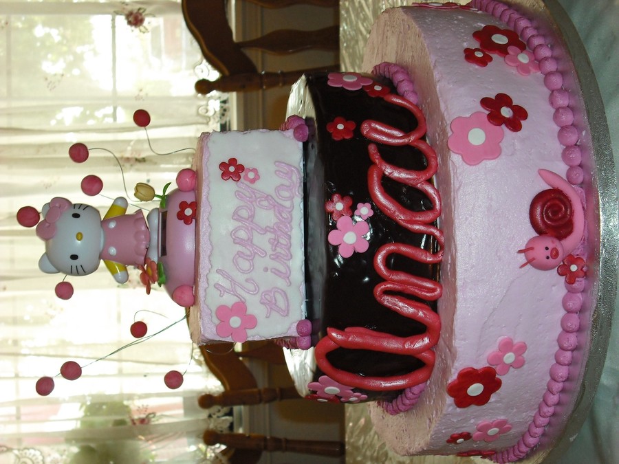 Bottom and top tier are all buttercream. The cakes were lemon supreme from Dun. Hines box mixed with orange jello and instead of water I substituded orange juice. Filling was strawberry cream cheese. The middle tier was chocolate soaked with sugar, instant coffee and rum. The filling was also cream cheese and frosted with creamcheese as well and poured ganache over it. All flowers are gumpaste and name was fondant. The topper was ordered thru ebay, it's solar powered which makes hello kitty dance. Everyone loved it. Thanks everyone from cc, for your ideas.
